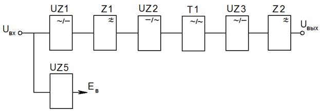 подается на выпрямитель (однофазная мостовая схема). Выпрямитель преобразует напряжение переменного тока в однополярное пульсирующее напряжение с коэффициентом пульсации