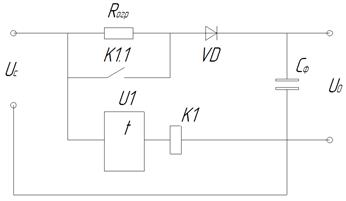 При исчезновении питания реле К1 отпускает, контакты К1.1 размыкаются, а при включении питания реле срабатывает с задержкой, определяемой схемой реле времени U1. Ток заряда конденсаторов фильтра ограничивается сопротивлением