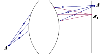 В идеальной оптической системе все лучи, исходящие из точки A, пересекаются в сопряженной с ней точке A΄0 . После прохождения реальной оптической системы либо нарушается гомоцентричность пучка и лучи не имеют общей точки пересечения, либо гомоцентричность сохраняется, но лучи пересекаются в некоторой точке A΄, которая не совпадает с точкой идеального изображения (рисунок 1). Это является следствием аберраций. Основная задача расчета оптических систем – устранение аберраций.