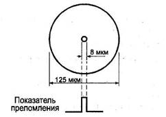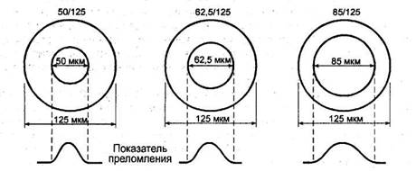 Типы и размеры волокон приведены на рисунке 1. Каждое волокно состоит из сердцевины и оболочки с разными показателями преломления. Сердцевина, по которой происходит распространение светового сигнала, изготавливается из оптически более плотного материала. При обозначении волокна указываются через дробь значения диаметров сердцевины и оболочки. Волокна отличаются диаметром сердцевины и оболочки, а также профилем показателя преломления сердцевины. У многомодового градиентного волокна и одномодового волокна со смещенной дисперсией показатель преломления сердцевины зависит от радиуса. Такой более сложный профиль делается для улучшения технических характеристик или для достижения специальных характеристик волокна.
