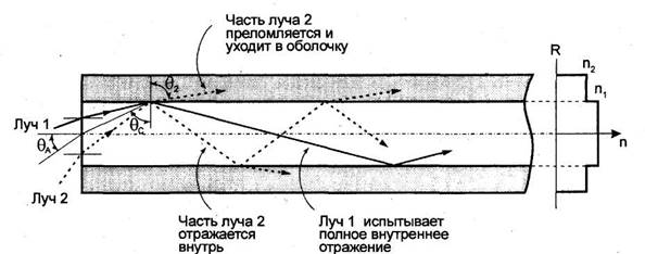 Если угол падения на границу раздела меньше критического угла падения (луч 2), то при каждом внутреннем отражении часть энергии рассеивается наружу в виде преломленного луча, что приводит в конечном итоге к затуханию света. Если же угол падения больше критического угла (луч 1), то при каждом отражении от границы вся энергия возвращается обратно в сердцевину благодаря полному внутреннему отражению.