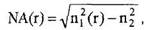 Для градиентного волокна используется понятие локальной числовой апертуры значение которой максимально на оси и падает до 0 на границе серд