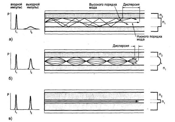 Если сравнивать многомодовые волокна между собой (рисунок 1 а, б), то градиентное волокно имеет лучшие технические характеристики, чем ступенчатое, по дисперсии. Главным образом это связано с тем, что межмодовая дисперсия в градиентном многомодовом волокне - основной источник дисперсии - значительно меньше, чем в ступенчатом многомодовом волокне, что приводит к большей пропускной способности у градиентного волокна.