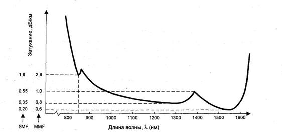На рисунке 5 приводится общий вид спектральной зависимости собственных потерь с указанием характерных значений четырех основных параметров (минимумов затухания в трех окнах прозрачности 850, 1300 и 1550 нм, и пика поглощения на длине волны 1480 нм) для современных одномодовых и многомодовых волокон.