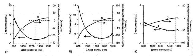 Рисунок 7 – Кривые временных задержек и удельных хроматических дисперсий для: а) многомодового градиентного волокна (62,5/125);