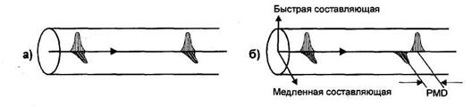 В одномодовом волокне в действительности может распространяться не одна мода, а две фундаментальные моды – две перпендикулярные поляризации исходного сигнала. В идеальном волокне, в котором отсутствуют неоднородности по геометрии, две моды распространялись бы с одной и той же скоростью, рисунок 8 а. Однако на практике волокна имеют не идеальную геометрию, что приводит к различной скорости распространения двух поляризационных составляющих мод, рисунок 8 б.
