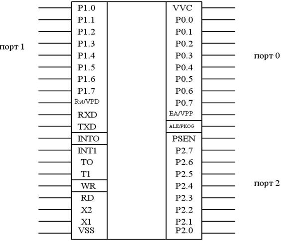 VSS – потенциал земли, VCC- основное напряжение питания, EA/VPP-при подаче на него сигнала высокого уровня запрещает работу с внешней памятью, RST- вход сигнала общего сброса при запуске МК, Х1,Х2- входы для подключения выводов кварцевого резонатора.