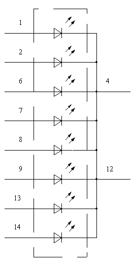 - сила света при прямом токе 20мА через элементы, не менее 0.15мкд.