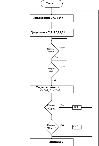 Для более простой реализации нажатия кнопок «Сброс» и «Всего» будем использовать два счетчика: С1 и С.