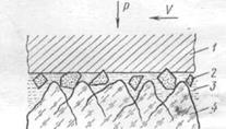 Стекла и другие хрупкие оптические материалы шлифуют свободным абразивом, используя жесткий металлический инструмент 1 (рис. 2.1), который давит на заготовку 4 с силой Р и перемещается с относительной скоростью v . Между заготовкой и инструментом располагаются зерна 2 абразивного порошка, смешанные с жидкостью 3. При перемещении инструмента по заготовке они взаимно изнашиваются под действием абразивных зерен и притираются друг к другу.