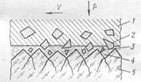 Шлифование таким инструментом 1 (рис. 2.2) производится на станке при перемещении его по заготовке 5 со скоростью v и давлением Р . Между инструментом и заготовкой находятся вырванные из связки абразивные или алмазные зерна 3 и слой смазочно-охлаждающей жидкости 4. Кроме силового воздействия инструмента на заготовку он подается на глубину снимаемого припуска с помощью механизма поперечной подачи станка.