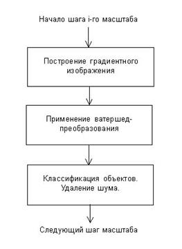На мал.5 схематично зображена послідовність виконання операцій для даної модифікації пропонованого нами методу. Перший етапом побудови градиентного зображення Dі(x,y) масштабу sі залишається таким же, як він і був описаний у попередній главі й полягає в комбінованій побудові градиентного зображення масштабу sі на основі градиентного зображення Dі-1(x,y) масштабу sі-1 і картини границь Eі-1(x,y), отриманої на sі-1 кроці. Далі, на другому етапі, до отриманого градиентному зображенню застосовується метод ватершед- перетворення, що дозволяє одержати замкнуті контури об'єктів і побудувати відповідну картину границь Eі(x,y). Після чого, на третьому етапі, виконується класифікація отриманих об'єктів, використовуючи як критерій приналежності об'єкта до шуму нечітку функцію f(q,e). Границі об'єктів, віднесених до шуму, віддаляються із зображення границь Eі(x,y). Після чого, виконуються аналогічні послідовності дій для наступних кроків.