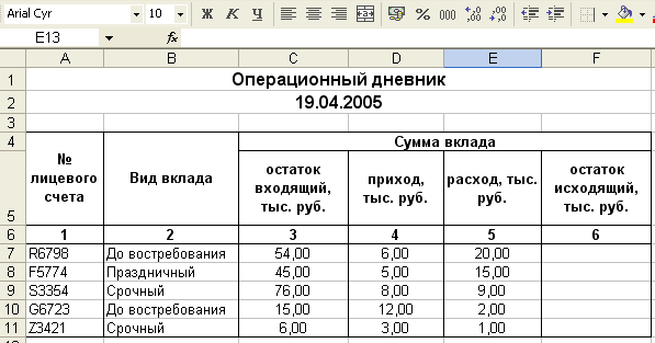 Рис. 9. Расположение таблицы «Операционный дневник» на рабочем листе Операционный дневник MSExcel