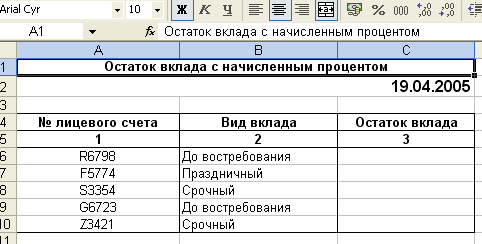 Рис. 10. Расположение таблицы «Остаток вклада с начисленным процентом» на рабочем листе Остаток вклада MSExcel