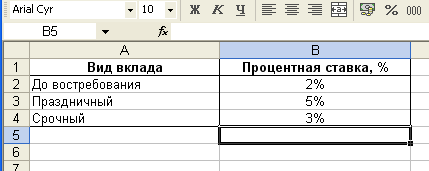 Рис. 11. Расположение таблицы «Процентная ставка» на рабочем листе Процентная ставка MSExcel