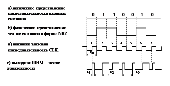 На рис. 2.1 приведен возможный вариант структурной схемы формирователя видеосигналов с ШИМ-манипуляцией для двоичного канала. Символы двоичного алфавита {0,1} на входе формирователя представлены в виде NRZ-сигналов с ТТL-уровнями, как принято в вычислительной технике.