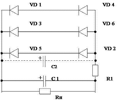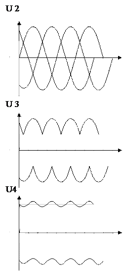 Ф - фильтр (R1-C1), пропускающий в нагрузку (Rн) постоянную оставляющую тока, и не пропускающий всевозможные гармоники. При этом напряжение в нагрузке U4 становится постоянным с небольшими пульсациями.