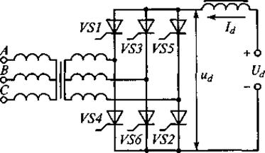 В схеме выпрямителя всегда открыты два вентиля, один в анодной и один в катодной группе. Напряжение и ток на выходе выпрямителя непрерывны, но пульсирующие. Число пульсаций за период равно шести.