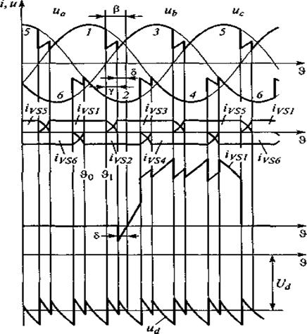 В этой схеме, так же как и в однофазной, управляющие импульсы подаются на тиристоры с опережением на угол β относительно моментов времени, соответствующих началу коммутации тиристоров при работе схемы в режиме неуправляемого выпрямителя (α= 0). Указанные моменты времени соответствуют прохождению через нуль линейных напряжений вторичных обмоток трансформатора, т. е. пересечению синусоид фазных напряжений Иа, Ив , и Ис .
