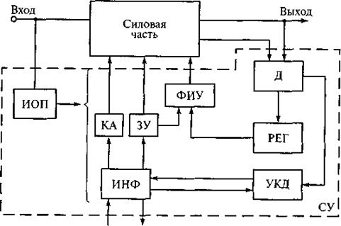 На рис. 6.1. приведена обобщенная структура СУ. В структуре выделены некоторые функциональные блоки, характерные для; СУ силовых электронных устройств. Блок датчиков Д содержит датчики регулируемых и контролируемых параметров. Так как обычно регулируются выходные параметры, то часть датчиков непосредственно входит в обратную связь канала регулирования. Сигналы с этих датчиков поступают на регулятор РЕГ, в функции которого входит формирование закона управления элементами силовой части. Блок ФИУ формирует импульсы управления, непосредственно поступающие на силовые элементы. По существу ФИУ является согласующим устройством между входами силовых приборов и выходом регулятора. Сигналы регулятора обычно являются маломощными и не отвечают требованиям, предъявляемым к импульсам управления силовых приборов (тиристоров, транзисторов и др.). Блок ФИУ называют также драйвером.