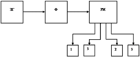 В этой схеме генератор ЗГ вырабатывает синусоидальное напряжение, частота которого больше, например, частоты сети в четыре раза. Выходное синусоидальное напряжение генератора в формирователе импульсов Ф преобразуется в прямоугольные импульсы, которые являются оптимальными по форме для управления. Эти импульсы поступают в распределительное устройство РИ, где происходит распределение импульсов почетырём каналам для мостовой схемы вентильного преобразователя. Каналы 1.. .4 передают импульсы управления на соответствующие вентили преобразователя.