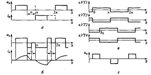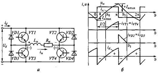 На рис. 3.10, б представлены диаграммы, иллюстрирующие работу схемы. Когда открыты транзисторы VТ1 и VТ4, напряжение на нагрузке имеет полярность, указанную (без скобок) на рис. 3.10, б, а ток нагрузки нарастает по экспоненциальному закону. В момент ΰ = π поступают управляющие импульсы, запирающие транзисторы VТ1, VТ4 и отпирающие транзисторы VТ2, VТЗ.