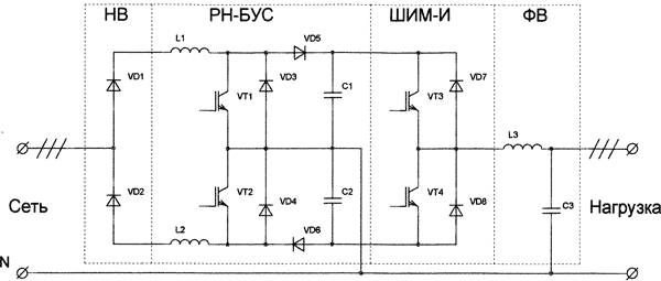 Одна из современных структур ДПЭ, используемая в источниках бесперебойного питания (ИБП) приведена на рисунке 1 [1,2]. На рисунке условно изображено по одной стойке мостового выпрямителя и мостового инвертора. Отличительной особенностью такой структуры является использование неуправляемого выпрямителя VD1, VD2 и регулятора повышающего напряжения (бустера) РН-БУС в звене постоянного тока. Дифференциальная схема бустера выполняется на двух IGBT-транзисторах VT1, VT2, диодах VD5, VD6, дросселях L1, L2 и накопительных конденсаторах C1, C2. Этот преобразователь обеспечивает следующие функциональные задачи: