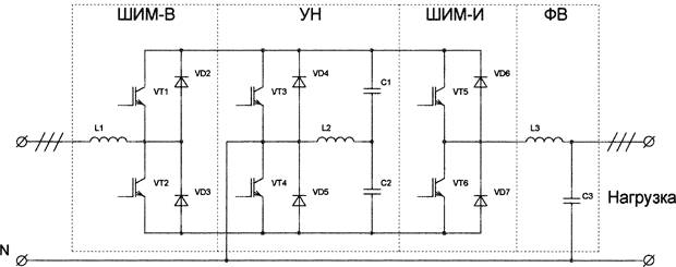 Такая структура преобразователя, появившаяся в последние годы, содержит двунаправленный мостовой ШИМ - выпрямитель (ШИМ-В), уравнитель напряжений (УН) и ШИМ - инвертор (ШИМ-И) (рис.2). ШИМ - выпрямитель реализован на IGBT-транзисторах VT1, VT2, фазных дросселях L1 и накопительных конденсаторах C1, C2 (на рисунке условно изображена одна фаза выпрямителя). Транзисторы шунтированы обратными диодами VD1, VD2. Такие преобразователи находят применение как в системах бесперебойного питания [2], так и современных электроприводах переменного тока [4].