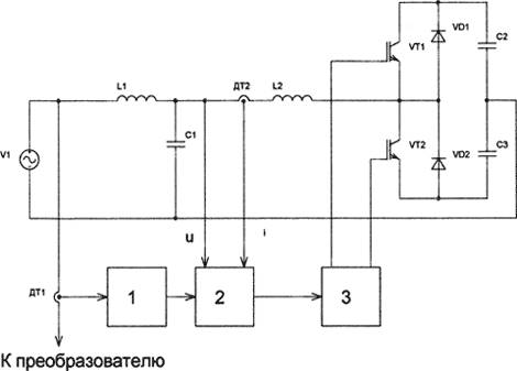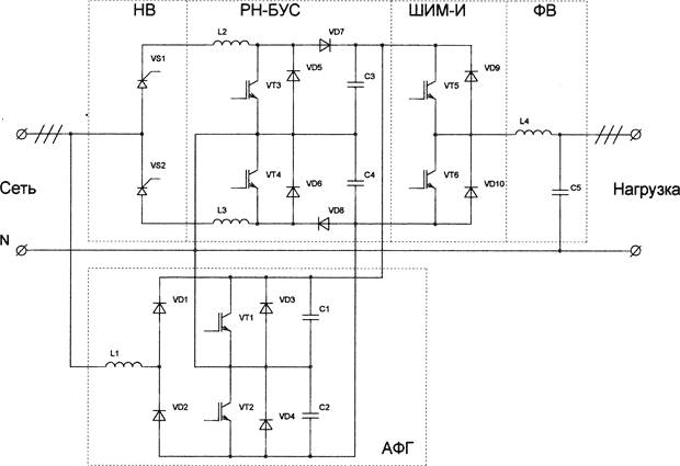 На рисунке 5 приведена схема гибридного преобразователя с зависимым АФГ. Такая структура отличается от системы ДПЭ с бустером (рис.1) тем, что параллельно входу выпрямителя VS1, VS2 подключены однофазные преобразователи АФГ, выполняющие функции однофазного ККМ в каждой фазе трехфазной системы ДПЭ (на рисунке условно изображена одна фаза АФГ и выпрямителя). Однофазный каскад АФГ выполнен по дифференциальной схеме на диодах VD1, VD2, транзисторах VT1, VT2 и емкостях С1, С2. Особенностью такой системы является наличие гальванической связи емкостей АФГ со звеном постоянного тока ИБП и необходимость информационного обмена между системой управления АФГ и системой управления бустером. Источники бесперебойного питания, построенные по такой структуре, обладают высоким значением входного коэффициента мощности и менее 4% искажения синусоидальной формы входного тока преобразователя [41].