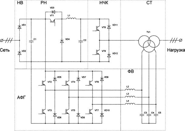 ШИМ - инвертор в составе АФГ обеспечивает незначительную часть активной мощности, создавая, в основном, реактивную мощность и мощность искажения для компенсации высших гармоник от НЧК. Выходной силовой трансформатор СТ в гибридной системе обеспечивает гальваническую развязку между выходами НЧК и ШИМ - инвертора, а также является повышающим для питания двигателя при длинном кабеле токоподвода. Выходной фильтр ФВ (L2-L4, C3-C5) АФГ предназначен для сглаживания высокочастотных пульсаций в нагрузке.