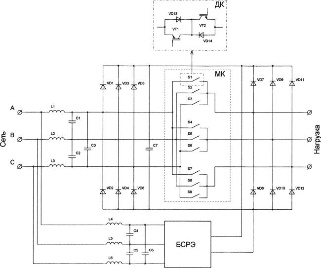 Следует отметить, что при нагрузке индуктивного характера коммутация ключей вызывает возникновение импульсных перенапряжений. Для снижения выбросов напряжения может быть использована демпфирующая схема, состоящая из трехфазных диодных мостов, подключенных к входу и выходу преобразователя, и общей емкости. Накапливаемая при коммутации ключей энергия в емкости сбрасывается в балластный резистор или рекуперируется в сеть с помощью специального блока сброса или рекуперации энергии (БСРЭ). Для контроля напряжения на демпфирующем конденсаторе предусмотрен блок выключения преобразователя, если напряжение превысит установленное значение. Этот блок также используется для контроля работы IGBT - транзисторов и их драйверов. Защита ключей по току реализуется на программном и аппаратном уровнях. Информация о загрузке ключей поступает с быстродействующих датчиков тока, установленных в каждой входной и выходной фазах преобразователя. Входной L-C фильтр обеспечивает ЭМС преобразователя с первичным источником питания.