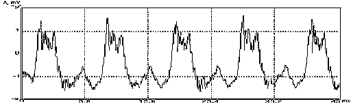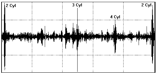 Еще одна, информационная фазо-временная технология, основана на сравнении формы сигналов, измеренных через фиксированные интервалы времени. Эта технология успешно используется для контроля состояния машин возвратно-поступательного действия с несколькими одинаковыми узлами (цилиндрами и поршнями), нагружаемыми последовательно через одинаковые интервалы времени. В качестве примера на рис.2 приведен сигнал вибрации двигателя автомобиля, по форме которого можно определить качество работы каждого из цилиндров.