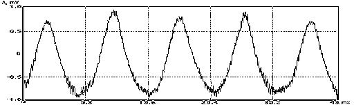 Сравнение формы сигналов, но уже с эталонной, можно осуществлять с помощью еще одной, информационной спектральной технологии, основанной на узкополосном спектральном анализе сигналов. При использовании такого вида анализа сигналов диагностическая информация содержится в соотношении амплитуд и начальных фаз основной составляющей и каждой из кратных ей по частоте составляющих. Такая технология применяется для анализа сигналов с датчиков давления, вибрации, шума, а также датчиков тока и напряжения в электрических машинах и аппаратах. В качестве примера на рис.3а приведены формы сигналов вибрации трансформатора без дефектов и на рис. 3б формы сигналов вибрации трансформатора с магнитным насыщением активного сердечника.