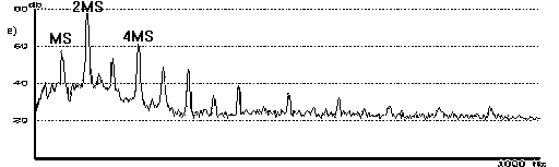 Частота модуляции определяет вид дефекта, глубина модуляции - степень развития дефекта. По составляющим спектра огибающей вибрации, определяющим изменение мощности сигнала во времени, в настоящее время идентифицируется вид и величина более десяти различных видов дефектов. На рис.9а и рис.9б приведены спектры огибающей высокочастотной вибрации подшипникового узла без дефектов и с износом наружного кольца, которые иллюстрируют возможности диагностирования подшипников.