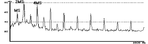 Рис. 10б. Спектры огибающей вибрации подшипников второй ступени редуктора с раковиной на внутреннем кольце подшипника.