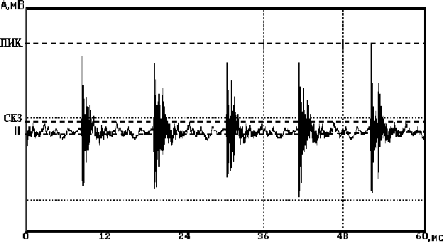 Как видно из рисунка, вибрация, возбуждаемая короткими импульсами, значительно изменяет мгновенную (пиковую) амплитуду сигнала, практически не изменяя ее среднеквадратичное значение (мощность). Отношение пикового значения (пик) к среднеквадратичному (СКЗ), называемое пикфактором, является тем параметром, который реагирует на появление отдельных коротких импульсов. Так, у случайного сигнала без ударных импульсов типовое значение пикфактора лежит в пределах от 3 до 4, а при появлении редких, но сильных импульсов может превышать значения порядка 20-30. Именно в подшипниках качения при плохой смазке или появлении раковин на поверхностях качения возникают такие импульсы. Поскольку импульсы короткие, они наиболее сильно возбуждают высокочастотную вибрацию. Сигнал, приведенный на рис.4, включает в себя составляющие высокочастотной вибрации, возбуждаемой как силами трения (стабильные во времени составляющие), так и ударами, число которых в единицу времени не должно быть большим, так как в последнем случае растет среднеквадратичное значение вибрации и падает величина пикфактора измеряемого сигнала.