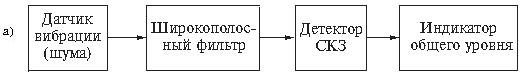 В основе всех средств измерения и анализа сигналов вибрации и шума лежат три типа устройств, выполняющих разные операции. Первый - датчик вибрации или микрофон, преобразующий колебания в электрический сигнал. Второй - фильтр, выделяющий компоненты сигнала в необходимой области частот. Третий - детектор, служащий для оценки амплитуды (мощности) выделенных компонент. Далеко не всегда фильтр подключается к выходу датчика и выполняется в виде электронного устройства. Он может быть акустическим, как, например, резонатор или механическим, как, например, упругая прокладка, и устанавливаться перед датчиком. Различные приборы содержат разные комбинации этих трех типов устройств, в зависимости от того, с какой информационной технологией они используются. Так, ниже показаны структуры основных видов приборов для контроля и диагностики машин и оборудования по вибрации или шуму.
