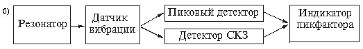 Простейшими являются измеритель общего уровня вибрации (шума) и прибор для измерения пикфактора сигнала вибрации, т.е. регистратор ударных импульсов. Структура этих приборов показана на рис.6а и рис.6б соответственно. В измерителе общего уровня фильтр может отсутствовать, если нет специальных требований к полосе частот измеряемого сигнала. В измерителе пикфактора для простоты реализации обычно используется механический резонатор в виде металлического стержня с резонансом на частотах выше 25 кГц. Столь высокая частота резонанса, с одной стороны, снижает габариты резонатора, а с другой стороны, позволяет получить более высокую величину пикфактора за счет того, что на высоких частотах стабильная во времени вибрация, являющаяся помехой и возбуждаемая силами трения в контролируемых узлах машины, минимальна.