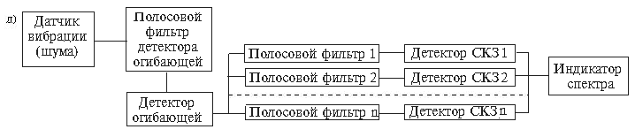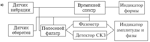 Из наиболее часто используемых средств измерений, реализуемых на базе вычислительной техники, можно выделить анализаторы формы, спектральные анализаторы и анализаторы спектра огибающей, структура которых также приведена на рис.6. Функции анализатора формы (рис.6в) заключаются в измерении амплитуд и фаз отдельных составляющих сигнала и в сравнительном анализе формы отдельных участков сигнала, начало и конец которых определяется углом поворота вала. Подобные анализаторы широко используются для диагностики машин возвратно-поступательного типа и роторов в процессе их балансировки. Анализатор спектра (рис 6г) обычно применяется при мониторизации всех типов машин и оборудования. Анализатор спектра огибающей (рис 6д) предназначен для исследования случайных процессов, мощность которых периодически изменяется во времени.
