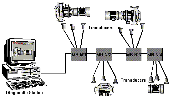 Количество блоков измерения и анализа сигналов в стационарных системах обычно определяется числом точек контроля и предельно допустимым интервалом между измерениями. Количество датчиков на один блок, может составлять от одного до нескольких десятков. В функции блока измерений входит и анализ вибрации или шума, а также других физических величин по программе, задаваемой диагностическим центром. Алгоритмы программы автоматически изменяются в зависимости от результатов диагностирования, т.е. от состояния объекта контроля. Иногда в функции блока измерений входит и сравнение результатов измерения и анализа с порогами, задающими границы допустимого изменения диагностических параметров. Если же допустимое время между периодическими измерениями достаточно велико, в системе может использоваться один блок, к которому датчики подключаются через электронные устройства коммутации сигналов. Блок измерений при этом может конструктивно объединяться в один корпус с диагностическим центром. Диагностический центр представляет собой либо один компьютер, объединенный в одну сеть с блоками измерений, либо группу компьютеров, работающих параллельно или с разделением функций.