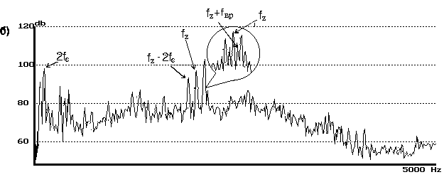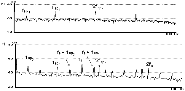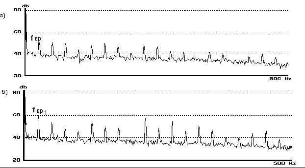 В вентиляторах, компрессорах, газовых (паровых) турбинах измерение вибрации корпуса не всегда дает желаемые результаты, и приходится встраивать в их корпус датчики давления (микрофоны). При диагностировании рабочих колес по пульсациям давления среды удается обнаруживать такие дефекты, как бой колеса, износ лопастей, кавитация. На рис.11а и рис.11б в качестве примера приведены спектры огибающей вибрации корпуса насоса в нормальном режиме работы и при износе (трещине) в одной из лопастей.