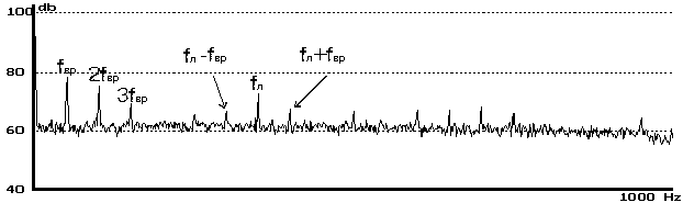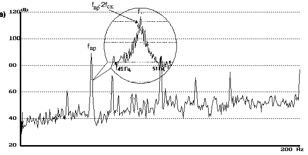 В диагностике электромагнитных систем электрических машин качественный скачок произошел в 1982 году, когда специалисты предприятия “Виброакустические системы и технологии” предложили диагностировать их по пульсирующим электромагнитным моментам, возникающим при дефектах обмоток или нарушениях симметрии воздушных зазоров. При одних видах дефектов (беличьей клетки асинхронного двигателя) возникают пульсирующие моменты на инфранизких частотах, что приводит к пульсации скорости вращения ротора. Такие пульсации скорости легко обнаружить по узкополосному спектру низкочастотной вибрации. Другие дефекты (обмотки статора машин переменного тока) создают пульсирующие моменты на низких частотах, что приводит к росту вибрации машины, измеренной по касательной к корпусу в плоскости, перпендикулярной оси вращения. Для обнаружения такого роста сравнивается вибрация в одной точке в радиальном к оси направлении и по касательной. Ряд дефектов (нарушение симметрии зазоров) сопровождается появлением пульсирующих моментов на более высоких частотах, на которых разделить вибрацию, возбуждаемую радиальными силами и пульсирующими моментами, оказывается практически невозможно. В таких случаях положительный результат дает анализ пульсаций электромагнитного поля, являющихся одной из составляющих, возбуждающих пульсирующие моменты. Эти составляющие поля возбуждают вибрацию машины на зубцовой частоте. Зубцовая вибрация при дефектах оказывается модулирована по амплитуде, что обнаруживается при узкополосном спектральном анализе вибрации. В качестве примера на рис.12а и рис.12б представлены спектры вибрации электрических машин переменного тока с различными дефектами электромагнитной системы.