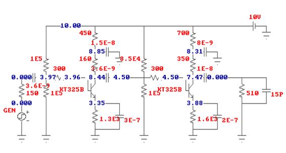 Rф=2.2е3Ом; Rэ=3.3е3Ом; Rб1=1е5Ом ; Rб2=1.3е5 Ом; Cр= 4е-9 Ф; Cф= 1е-9 Ф; Cэ=7е-8Ф;
