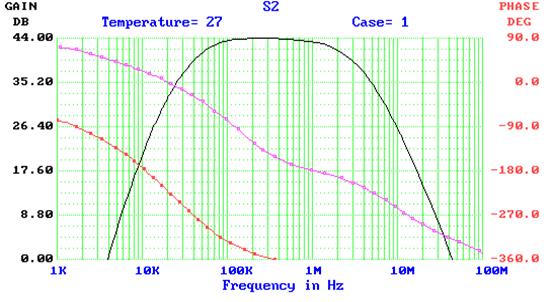Реализуемые схемой - верхняя частота - Fв = 2.3Мгц и коэффициент усиления К = 22Дб = 12.6