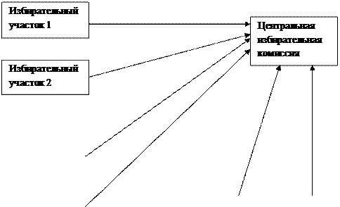 Схема проведения политических выборов такова: в каждом местном избирательном участке после проведения голосования проводится подсчёт количества голосов, проголосовавших за каждого из кандидатов. Эта информация передаётся в Центральную избирательную комиссию, расположенную, как правило, в административном центре (столице) страны или республики (в зависимости от того, на каком административном уровне проводятся выборы), где полученная информация суммируется и обрабатывается. С помощью графической схемы эту систему можно представить в таком виде: