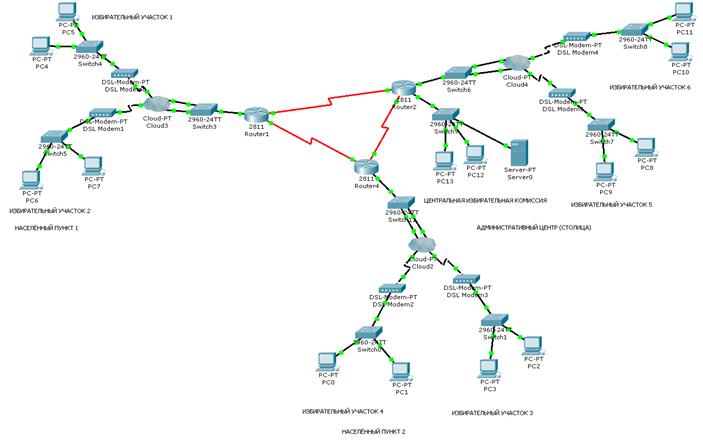 Маршрутизаторы каждого населённого пункта будут соединяться друг с другом кабелем «SERIAL». Хотя информация передаётся от местных избирательных участков лишь в центральную избирательную комиссию, маршрутизаторы будут помимо маршрутизатора в административном центре подключаться ещё и к маршрутизаторам в соседних населённых пунктах. Это повысит надёжность сети, так как кроме прямого пути передачи информации в центральную избирательную комиссию от местных избирательных участков будет иметься обходной, по которому будет происходить передача информации в случае выхода из строя прямого пути. В предыдущем разделе данной курсовой указывалась необходимость информационной изоляции местных избирательных участков друг от друга. Это будет достигнуто за счёт представления местных избирательных участков как отдельных виртуальных сетей и использования «ACCESS-листов». Это осуществлено следующим образом (см. таблицы 1 и 2).