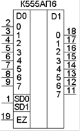 • Вывод в системный порт D1 и одновременное открытие D2 - системный порт D1 работает как восьмиразрядный счетчик (т.е. в этот регистр каждый цикл последовательно выдаются числа от 0 до 255), и эти значения проходят через D2. Коммутация мультиплексора D2 определяется опцией -Input nibble (см. раздел Options).