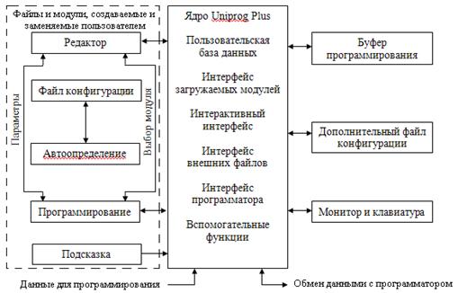 Блоки: "программирующий модуль", "модуль редактора", "модуль автоопределения" и "конфигурационный файл" доступны пользователю при написании собственной программы программирования.