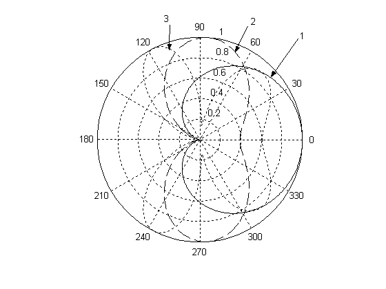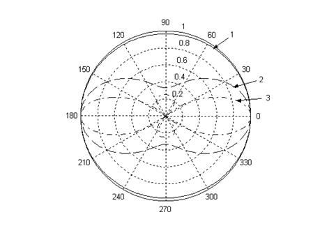 Диаграммы направленности микрофона – асимметричного приёмника градиента давления, рассчитанные для d = 0.03 м, r = 0.1 м и следующих частот: кривая 1 для 100 Гц, кривая 2 – 5000 Гц и кривая 3 – 10000 Гц.