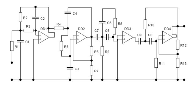 Дана схема смугового активного фільтра складається з чотирьох каскадів, які зв’язані між собою і утворюють смуговий активний фільтр.